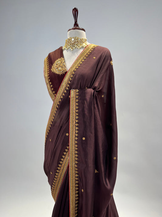 BROWN CREPE SILK SAREE WITH FINE MARODI BORDER WORK