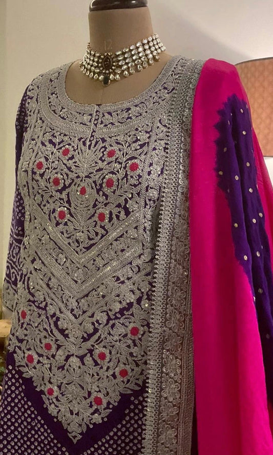 PURPLE & SHOCKING PINK AABHA KURTA SET IN SILVER MARODI