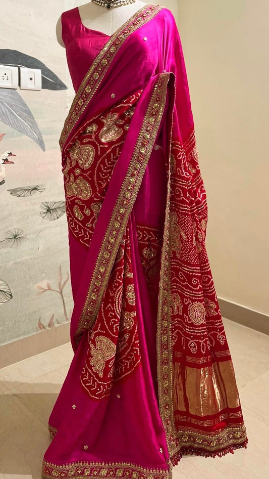 YELLOW TO PINK OMBRE SEQUINNED BANDHEJ SAREE