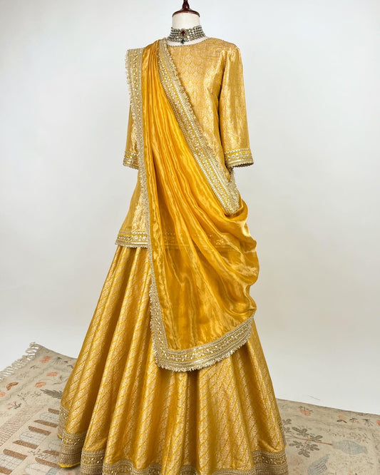 MUSTARD BROCADE LEHENGA WITH SHORT KURTA AND TISSUE DUPATTA
