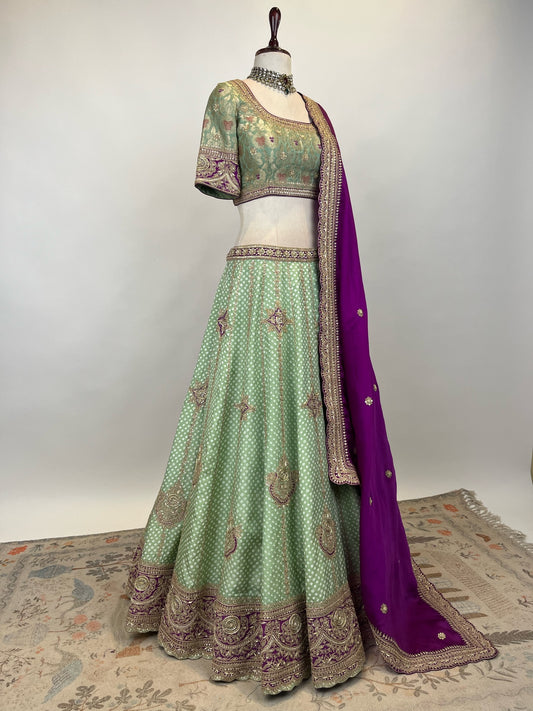 SAGE GREEN BANDHEJ LEHENGA IN MARODI & RESHAM WORK