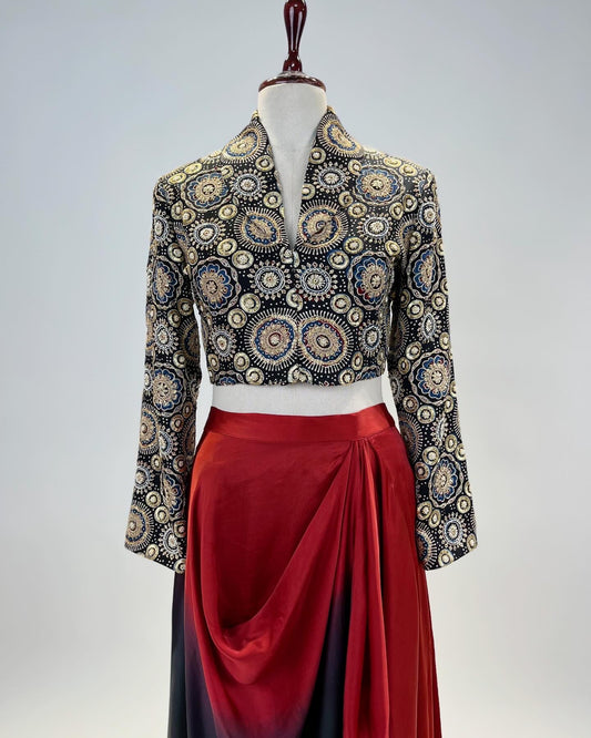 BLACK & RED BANDHEJ KURTA ENSEMBLE IN MARODI & RESHAM WORK