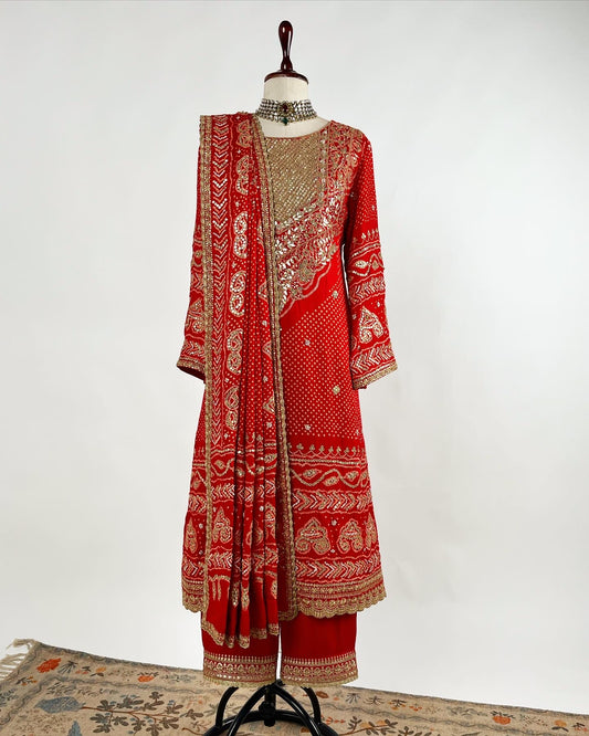 HENNA GREEN AABHA SET WITH RED BANDHEJ & EKTAAR EMBROIDERY