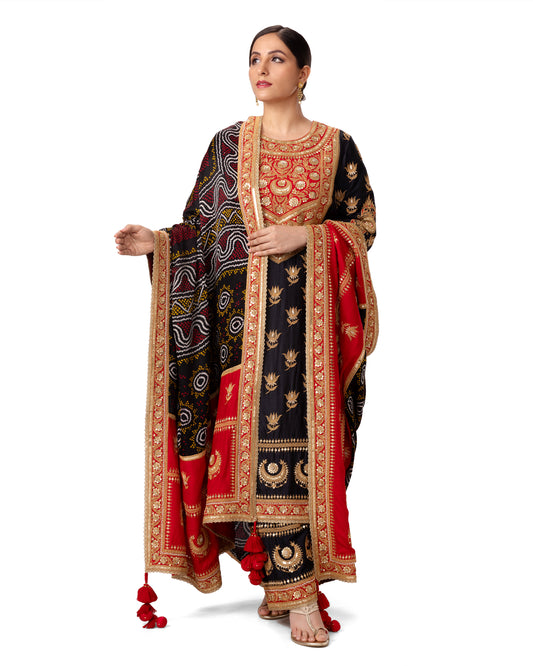 RED GOTAPATTI LEHENGA WITH OMBRE RED MAROON BANDHEJ DUPATTA