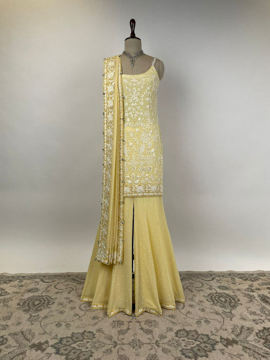 Yellow Parsi Gara Pearl Embroidered Sharara Set