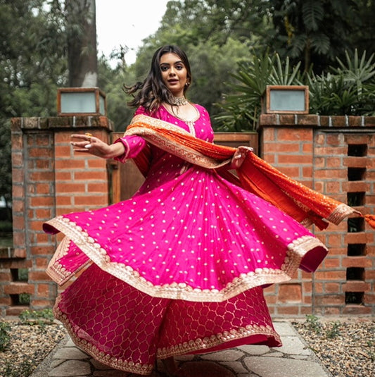 SHOCKING PINK AND ORANGE KURTA ENSEMBLE WITH EK - TAAR MOCHI WORK AND SILK CRUSHED SHARARA