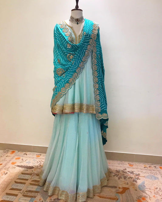 MINT BLUE SHORT KURTA & SHARARA WITH OMBRE GOTA & MARODI WORK DUPATTA IN GAJI SILK