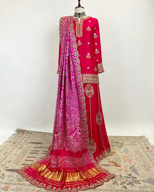 • RED BANDHEJ  ON BANDHEJ SHARARA SET IN ZARDOSI & RESHAM WORK EMBROIDERY