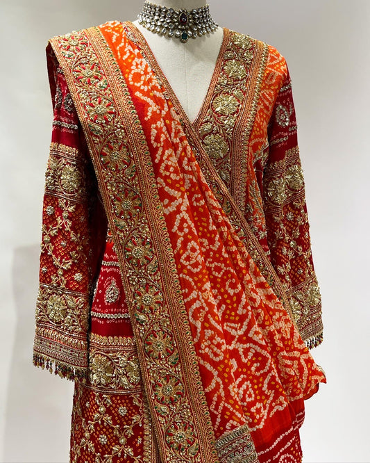 RED BANDHEJ ON BANDHEJ SHARARA SET IN ZARDOSI & RESHAM WORK EMBROIDERY