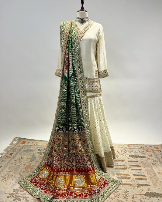 PREDRAPED SHARARA WITH DUPATTA WITH AN IVORY SEQUIN BLOUSE